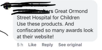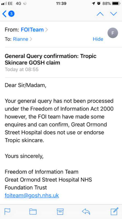 Juice Plus+ reps aren’t the only ones lying about throw party use and endorsement of their brand. Here’s a Tropic Skincare rep claiming that Great Ormond Street Hospital (GOSH) use their products: