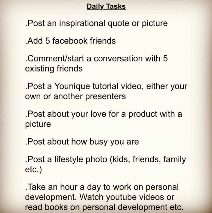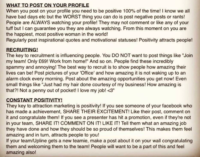 And just in case you’re in any doubt as to how to spread this fake positivity, your MLM company helpfully tells you exactly what to do on Facebook every day: