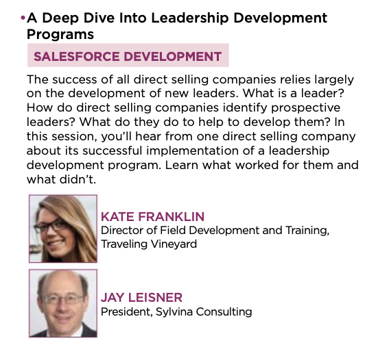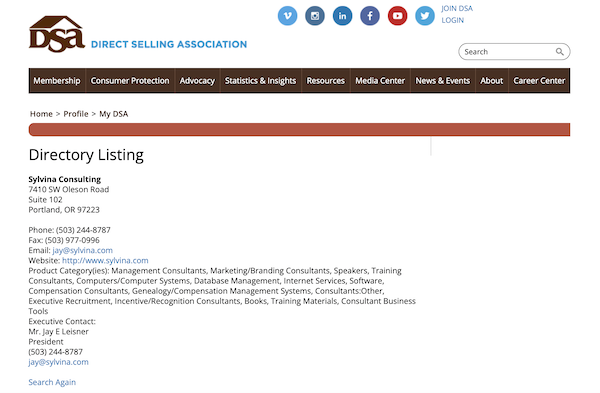 Jay Leisner is the President of Sylvina Consulting and an MLM compensation plan expert who has given presentations at conferences held by the US Direct Selling Association in 2004, 2006, 2009, 2014, and 2018, according to his bio.