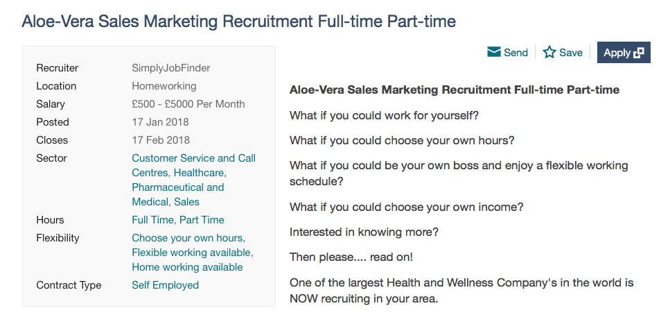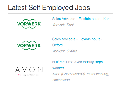 We’ve noticed that, among genuine job opportunities on your website, there are adverts for MLMs. And not just one or two. These are your current “Latest Self Employed Jobs”, at the time of writing this letter: